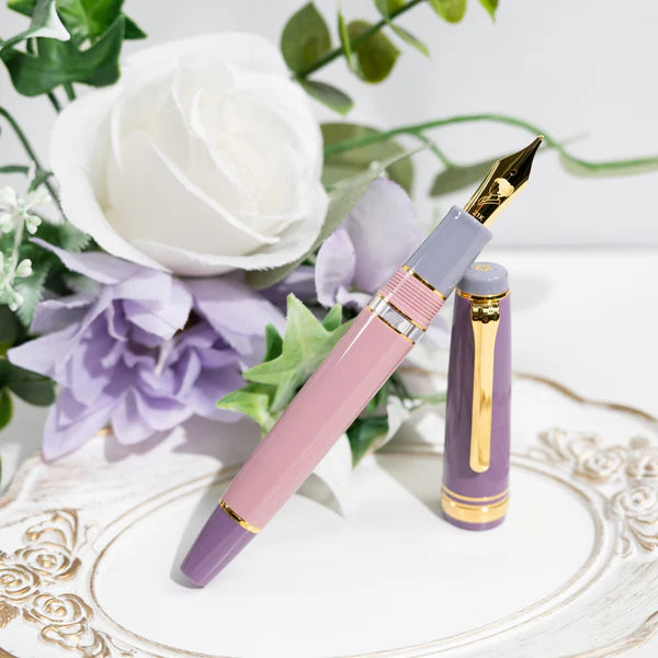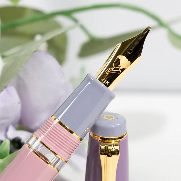 The Sailor Realo Taisho Roman limited edition series fountain pen was created for Japanese stationery store Poesie Bungu to celebrate the time of high fashion and elegance from the Taisho era in Japan. There are three colourways in this series, each with a unique nib engraving design and golden flower finial.