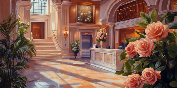 Imagine yourself stepping into a grand old hotel, one of those charming gems from a bygone era, where the air is still thick with stories and history. The light streams through the tall windows, bathing everything in a soft, warm glow. The scent of fresh roses mingles with the subtle notes of antique wood, creating an atmosphere both nostalgic and comforting. Everywhere you look, delicate peachy pink flowers spill over from grand vases, decorating the hall with their lively, blushing hue, as if they've bloomed just for you.