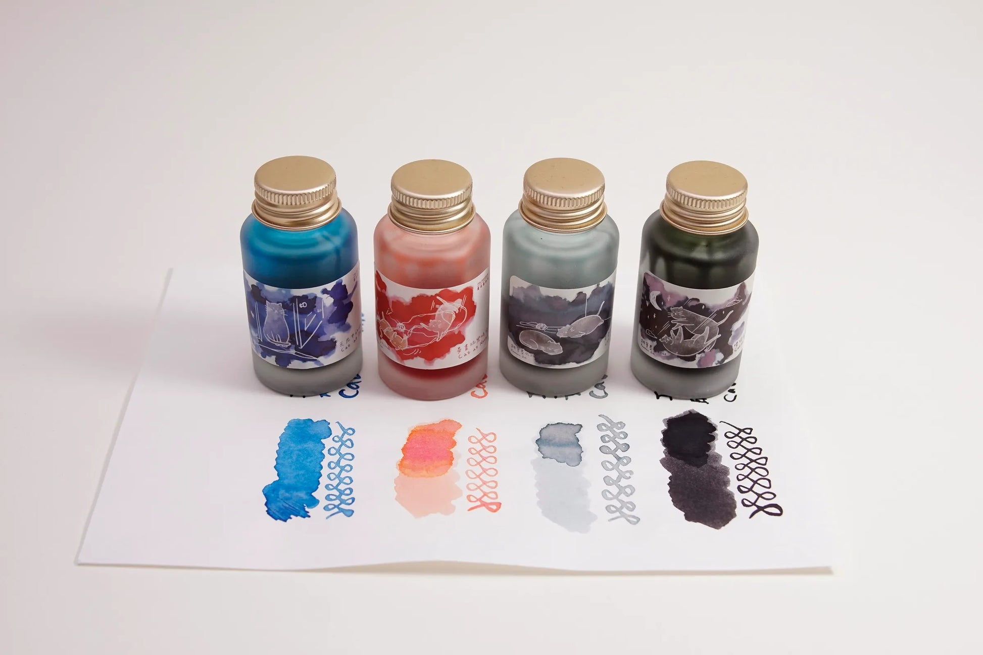The Cat's Daily collection is inspired by the daily lives of the cats owned by one of the designers at Ink Institute. From sleepy mornings and playful afternoons to lazy evenings and wild midnight hunts, each ink captures a unique feline moment. Like cats themselves, these colours are full of surprises with gentle shading, vivid sheens, and quiet charm.