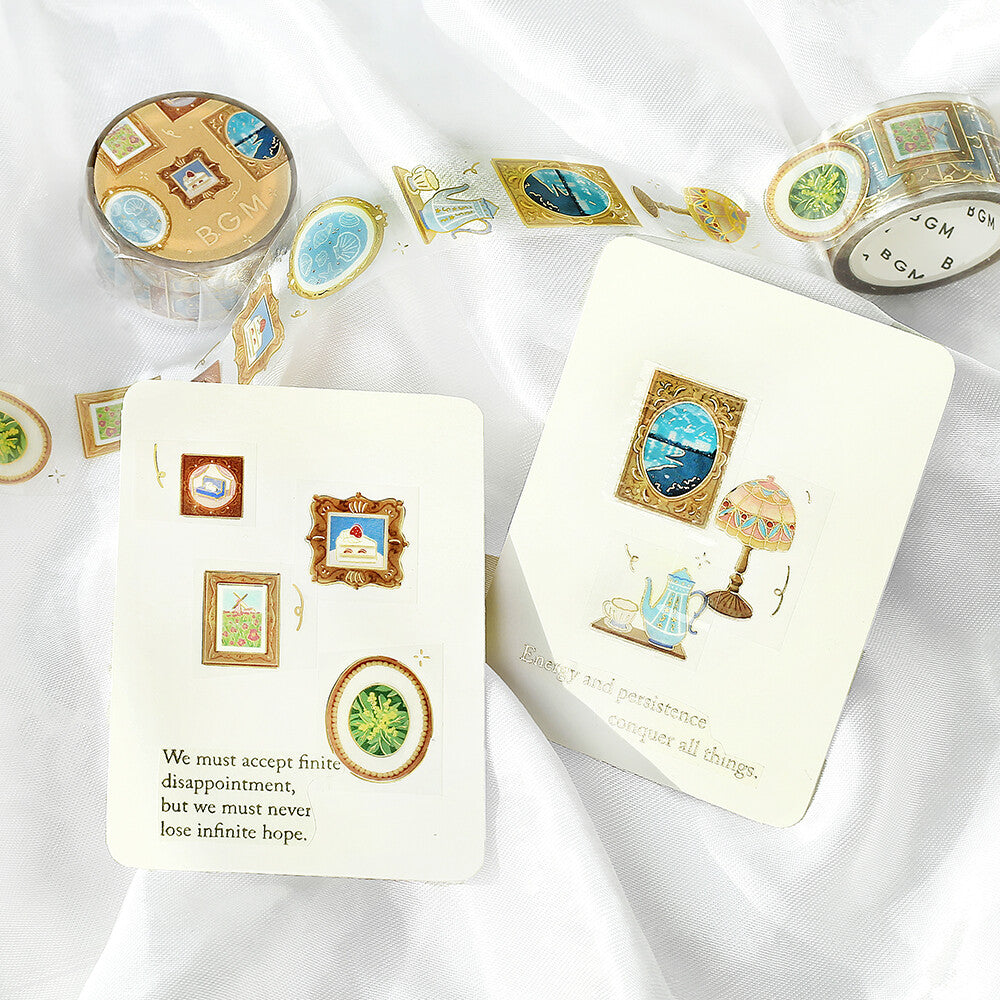 Clear tape by BGM featuring various framed arts, with gold foil details.