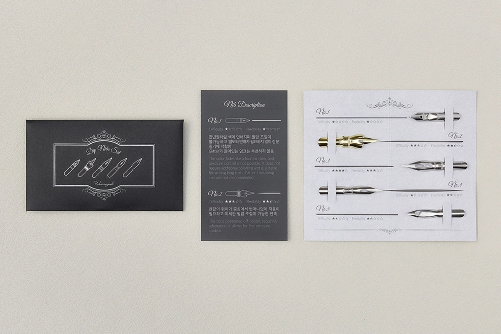 These nibs are compatible with standard dip pen holders. The set includes five soft and firm nibs with various line variations.