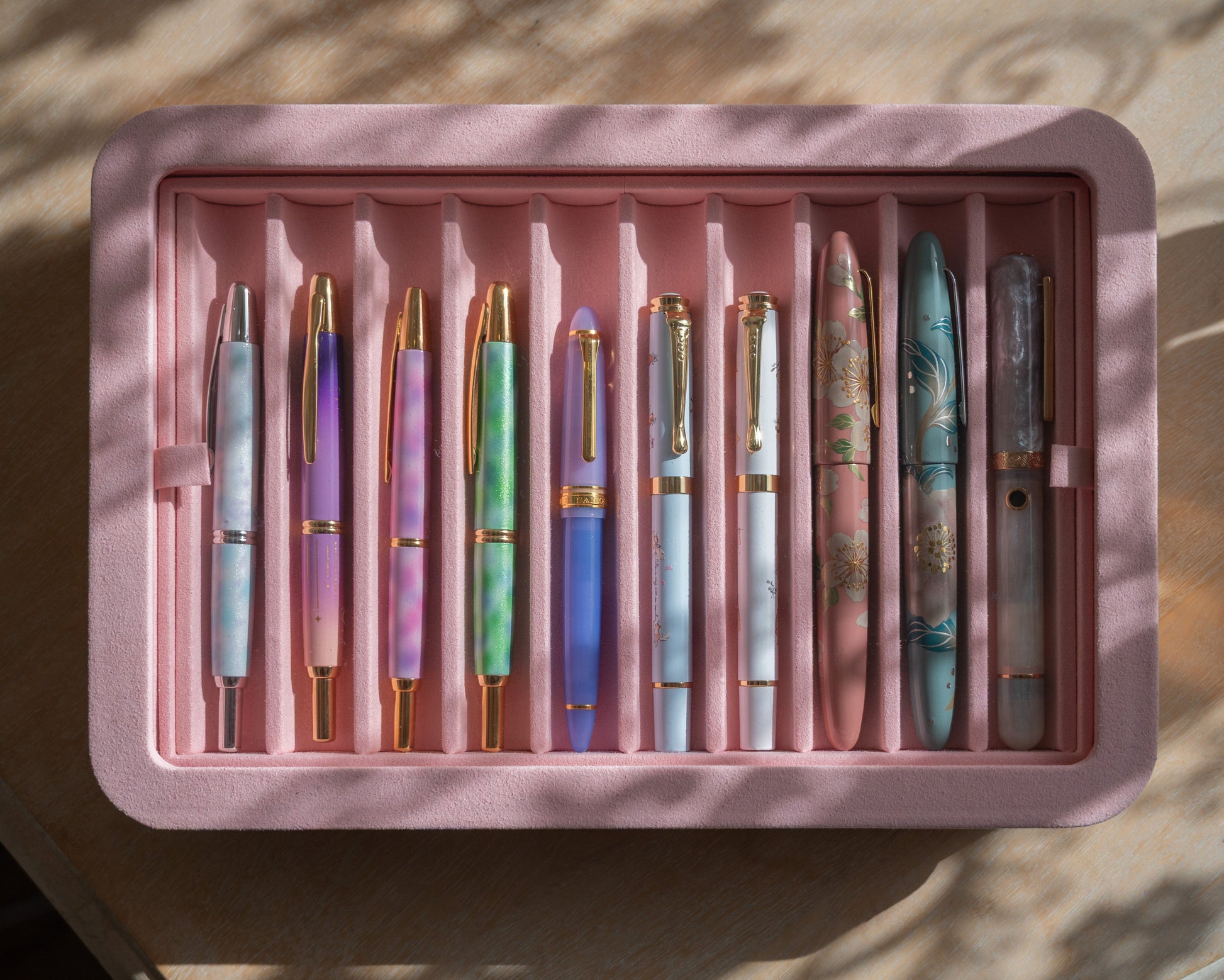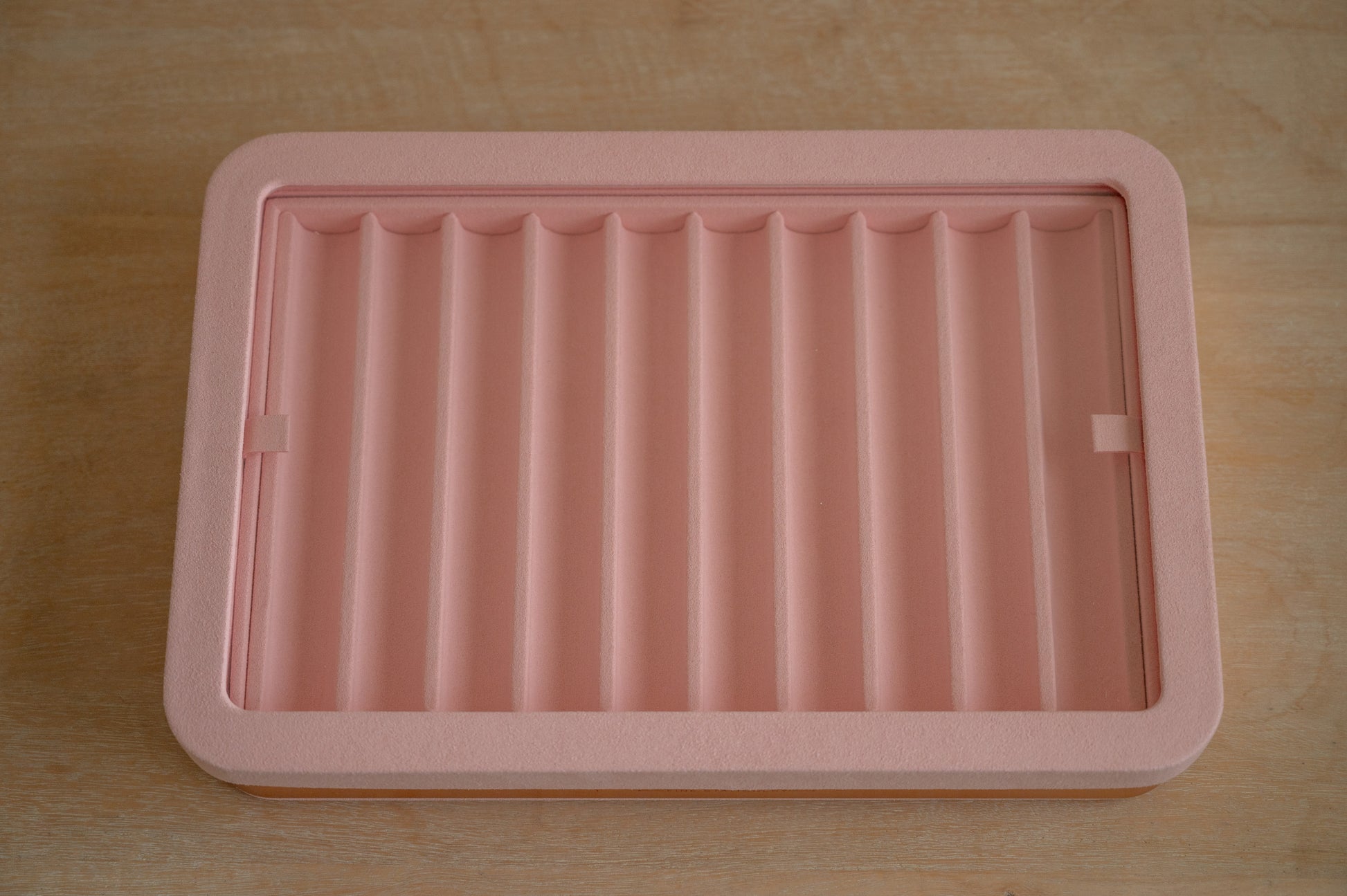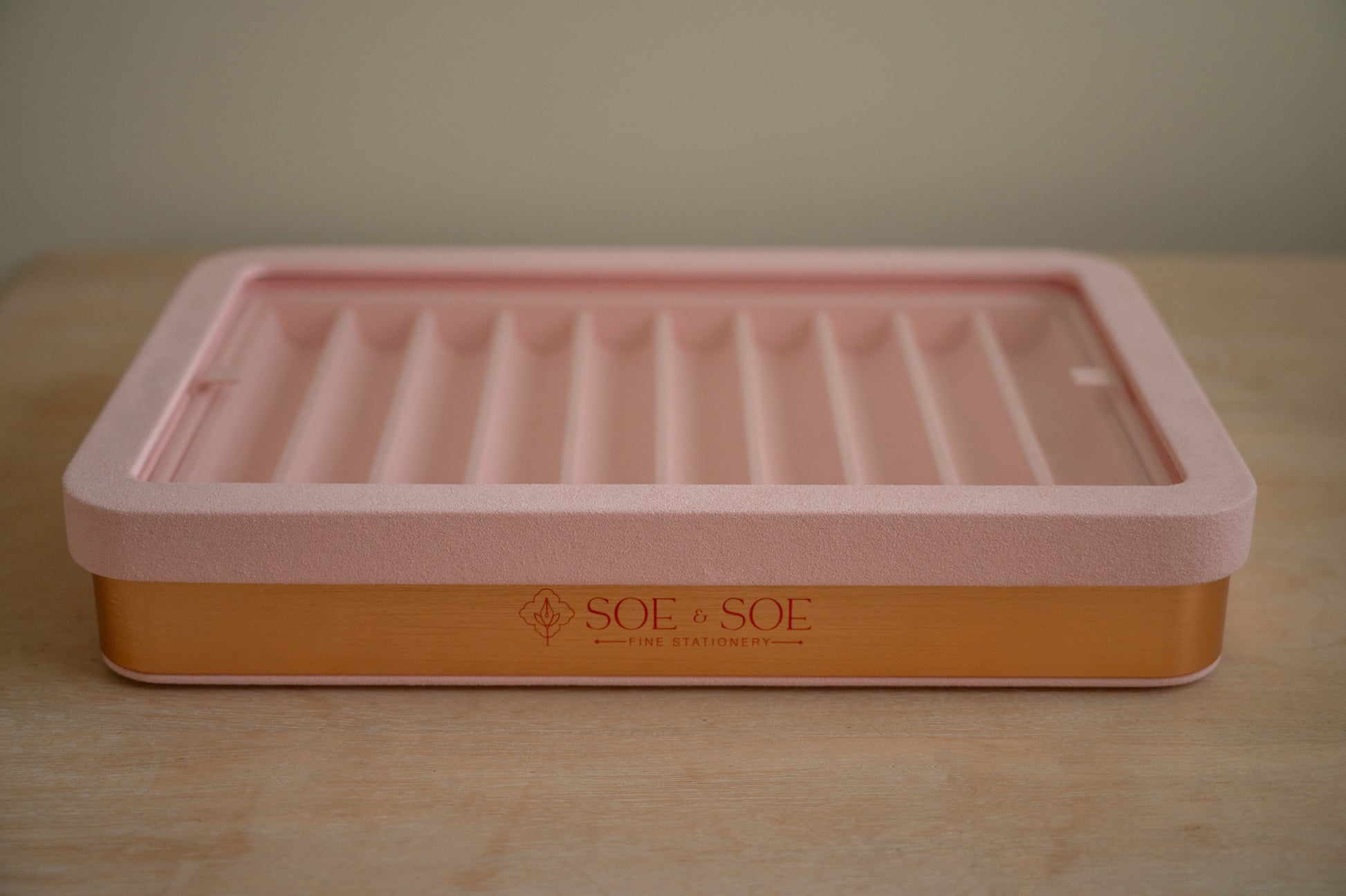 With over a decade experience as a boutique jewellery designer, Yue has created a unique pen box that is beautifully crafted with soft-touch microfibre suede finish with luxurious rose gold metal frame to fit 10 pens with removable window display lid to keep your pens dust-free. The pen tray insert is removable to allow you additional space to use without worrying about delicate items rolling off your desk.