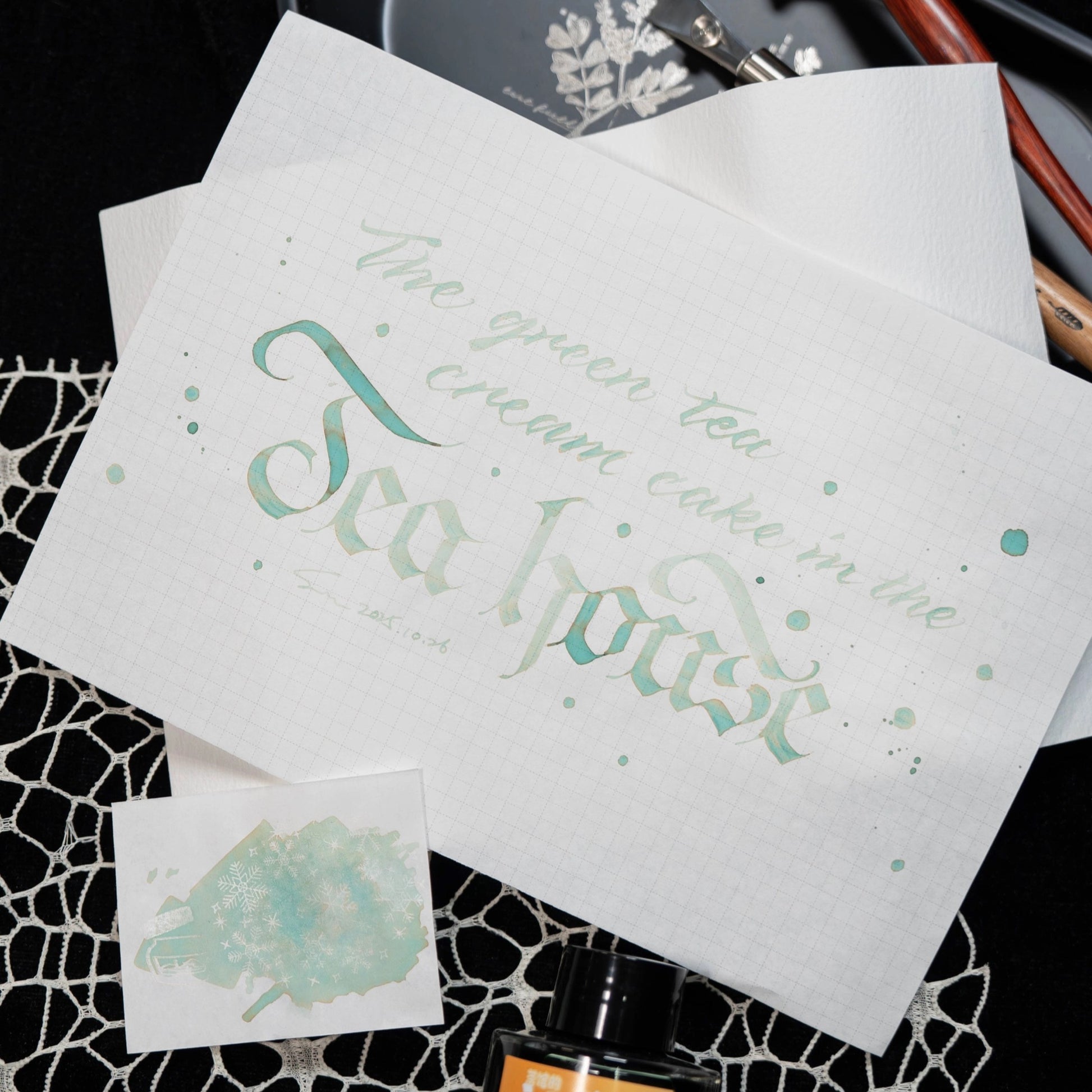 Green Tea Cream Cake in the Tea House is a pastel mint green ink with light brownish haloing.