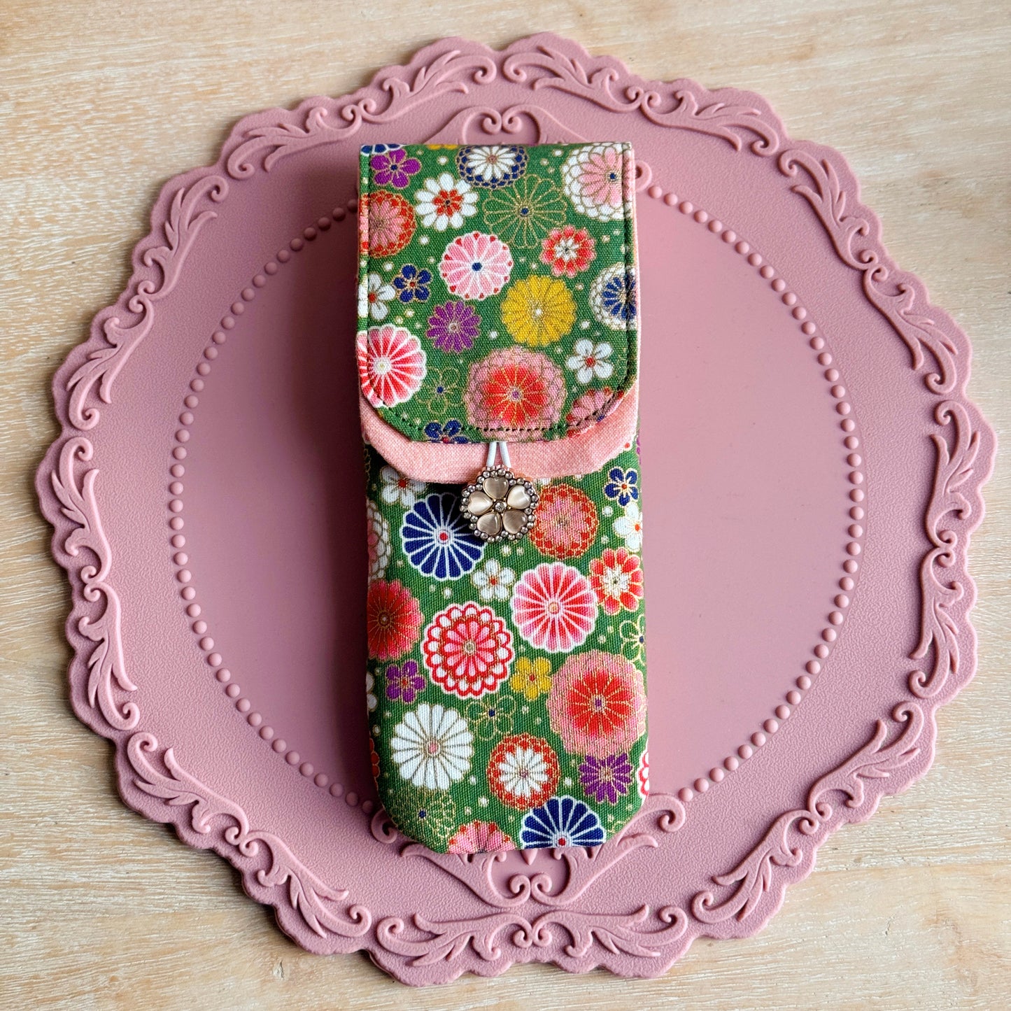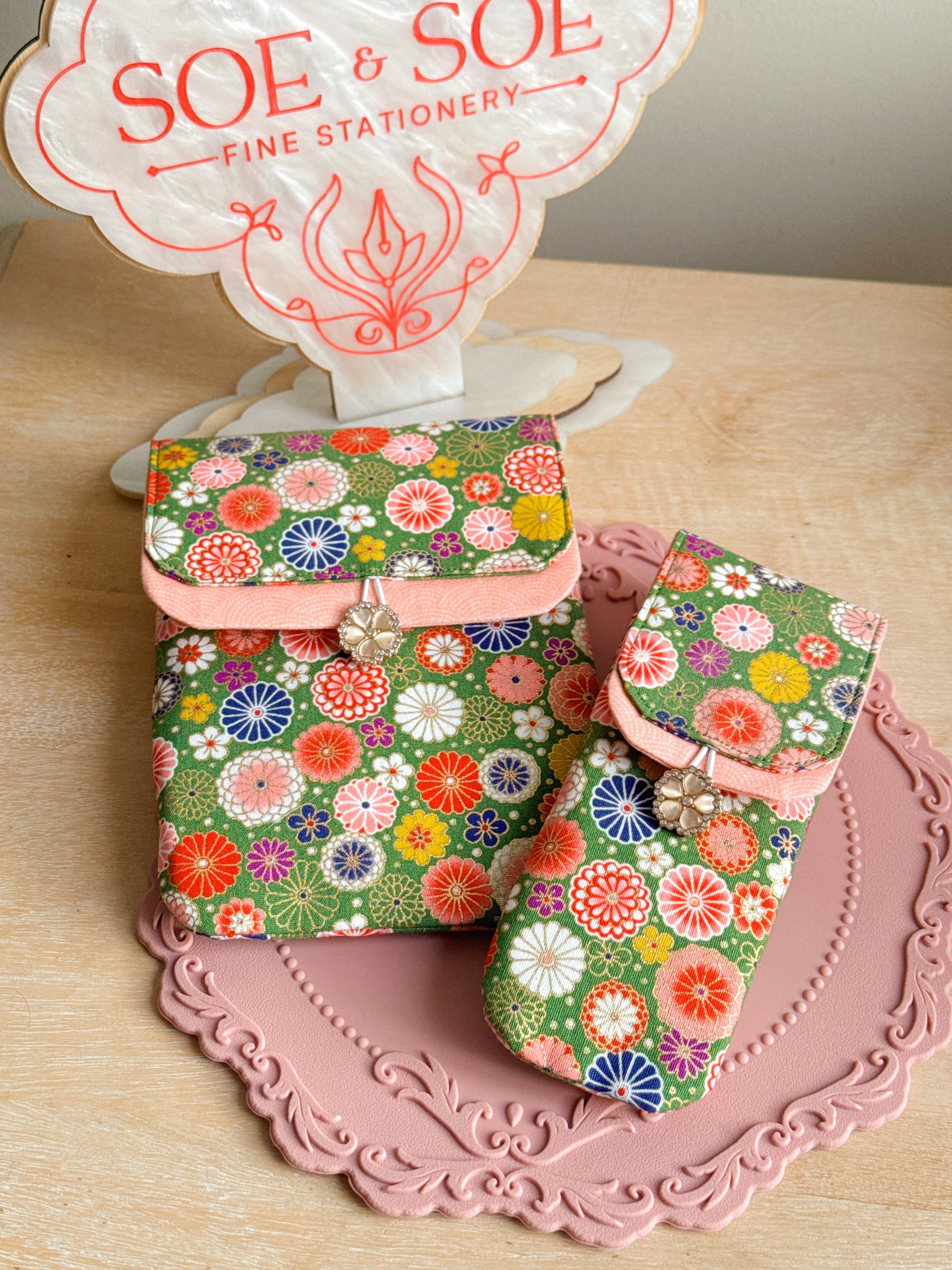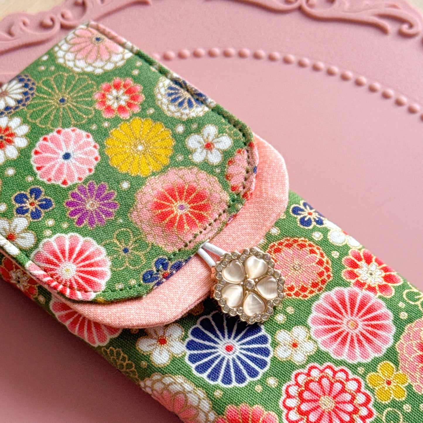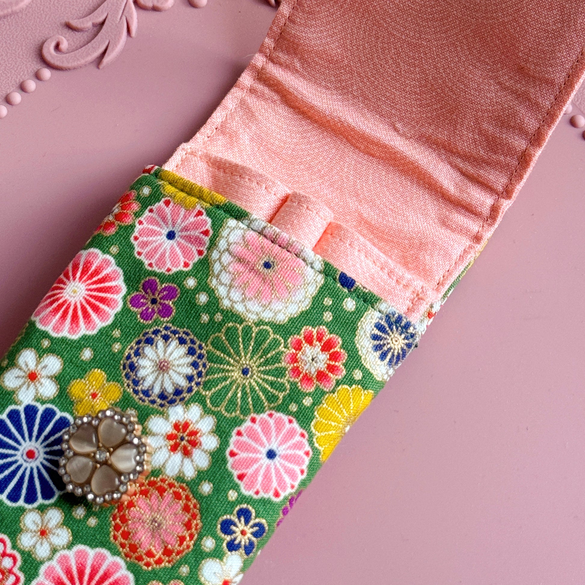 Our signature individual slot pen case to fit 6 of your beloved fountain pens featuring a colourful Japanese chrysanthemum print with metallic gold details on the paired with subtle peach seigaiha wave inner, finished with a golden floral rhinestone button closure.