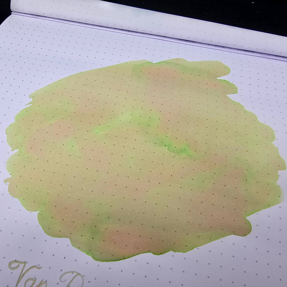 Harvest Tide is a mellow golden base ink with cool green halos and warm rose pink shading.