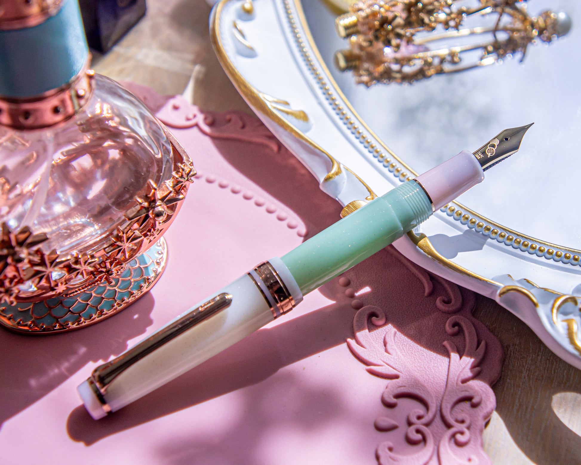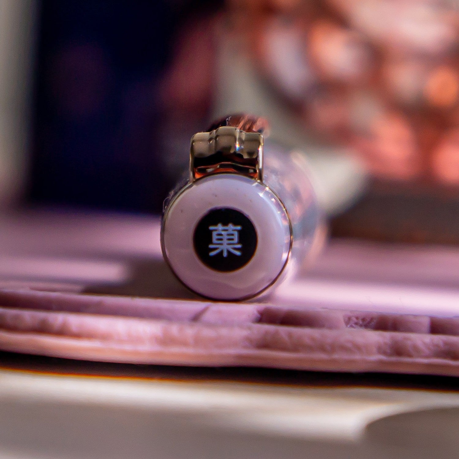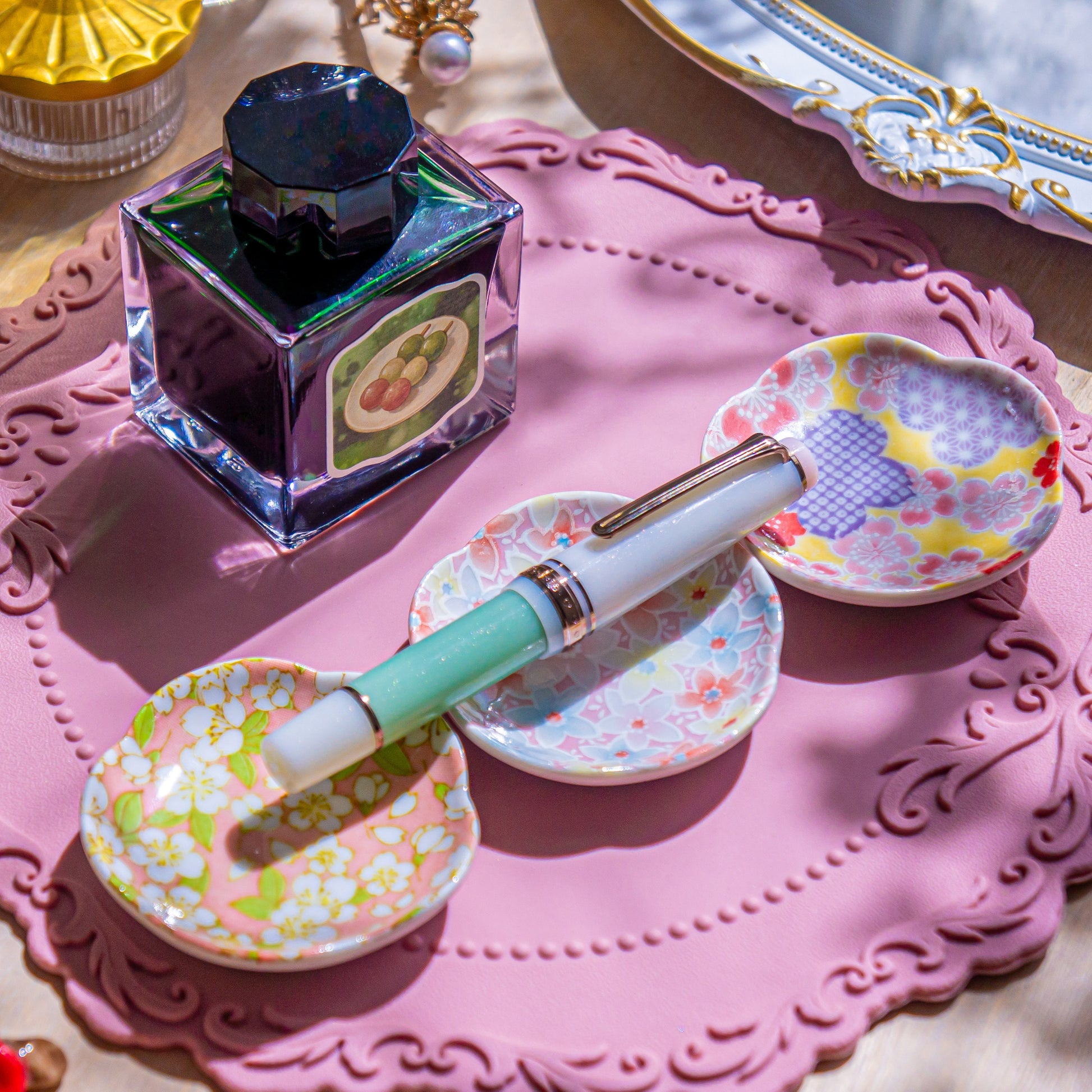 Sanshoku Dango or Three Coloured Dumplings are often enjoyed during cherry blossom viewing in Japan, with the pink representing the sakura, white for sake and green for the early buds of spring. The three colours are incorporated into the body and cap of the pen with a translucent fine shimmer. The finial features the kanji for sweets and the cap ring reads "♡ ♡ Poesie ♡ ♡".