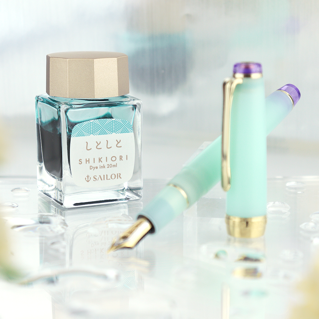 The Shikiori Amaoto or four seasons Sound of Rain collection is inspired by the changing appearance of plants and trees with scenes of rain and its aftermath. The fountain pens in this series are fitted with Sailor's signature 21k two-toned Gold nib unlike most pro-gear slim models which usually feature 14k gold nibs.
