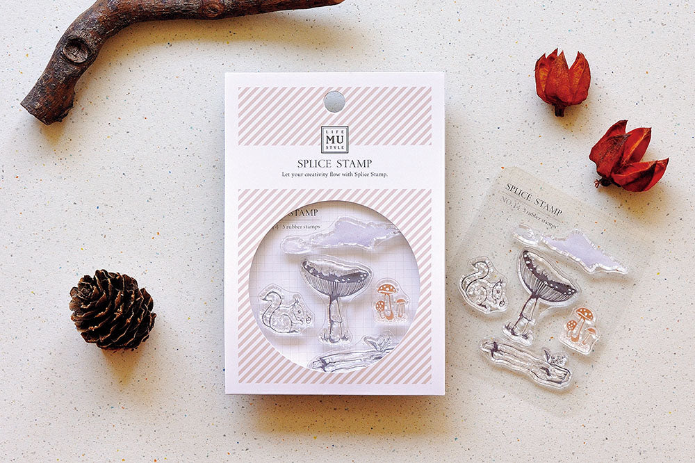 This set of 5 stamps features clouds, squirrel, mushrooms and log.