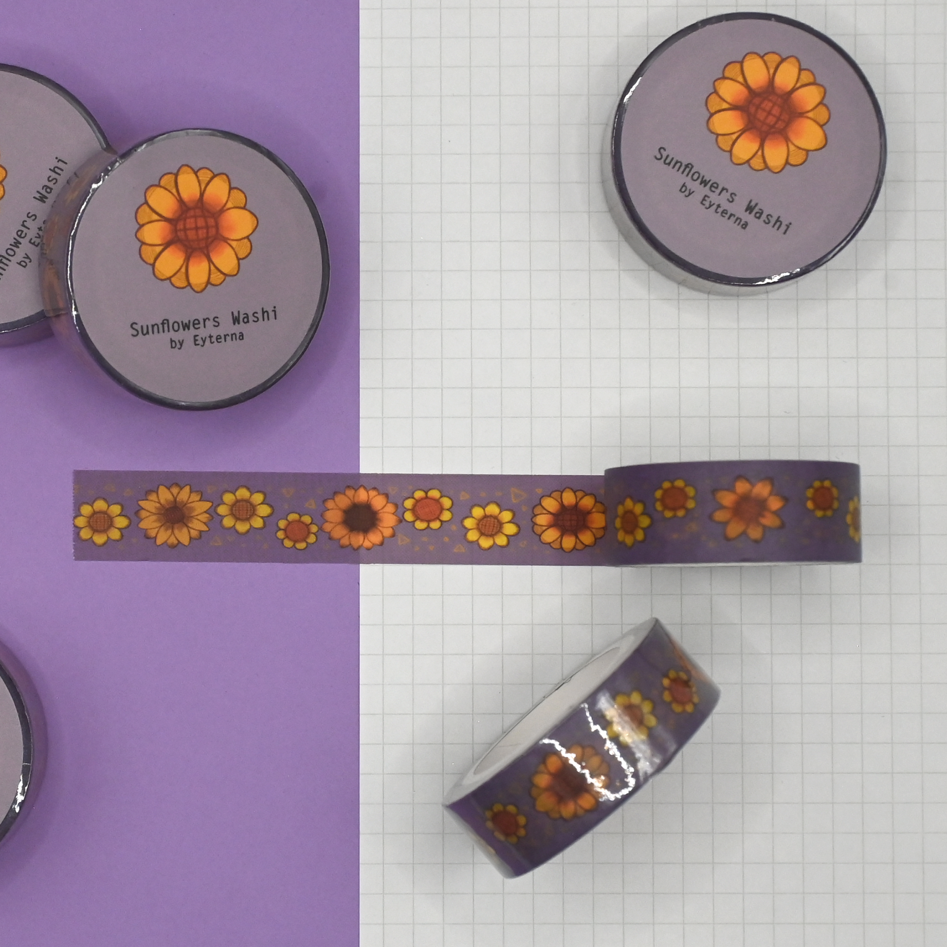 10m roll of 15mm wide washi tape with cheery sunflowers on purple background illustrated by Sydney-based artist Eyterna.